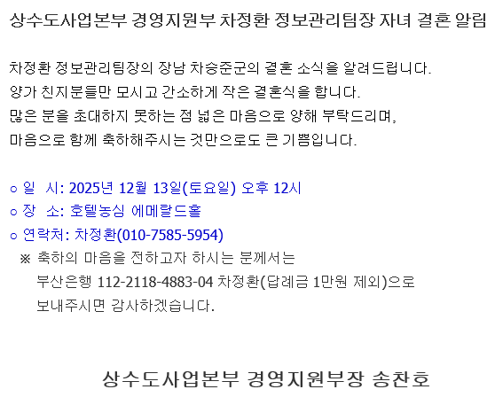 [결혼]상수도사업본부 경영지원부 차정환 정보관리팀장 자녀 결혼 알림 상세보기 [결혼]상수도사업본부 경영지원부 차정환 정보관리팀장 자녀 결혼 알림 조회 84 상수도지부 2025-12-04 16:26:23 이전글 [결혼] (❁´◡`❁) 덕산정수사업소 오승권 주무관 결혼 알림 (❁´◡`❁) 다음글 ♥♡상수도사업본부 덕산정수사업소 방영환 주무관 장녀 결혼 알림♡♥
