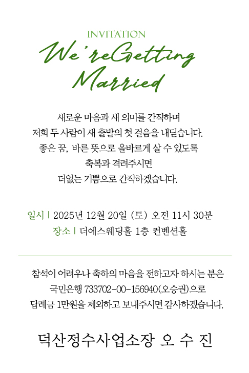 [결혼] (❁´◡`❁) 덕산정수사업소 오승권 주무관 결혼 알림 (❁´◡`❁) 상세보기 [결혼] (❁´◡`❁) 덕산정수사업소 오승권 주무관 결혼 알림 (❁´◡`❁) 조회 28 상수도지부 2025-12-12 17:23:47 이전글 (부고) 상수도사업본부 남부사업소 황재호 주무관 모친 별세 알림 다음글 [결혼]상수도사업본부 경영지원부 차정환 정보관리팀장 자녀 결혼 알림